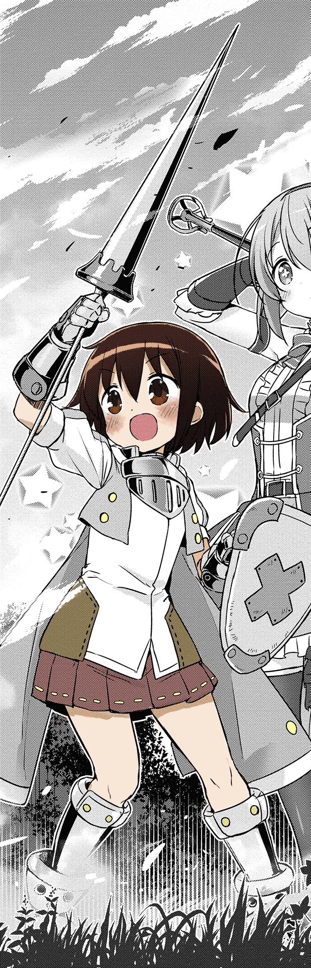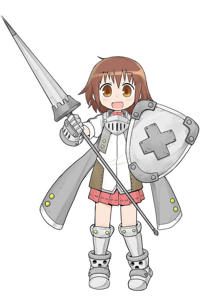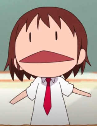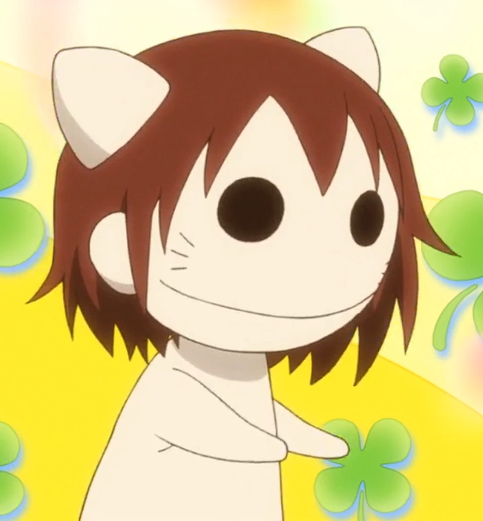 Yasuna is a high school student, with short brown hair, bangs parted in the middle, and dark brown eyes. She also has small chin-length strands.